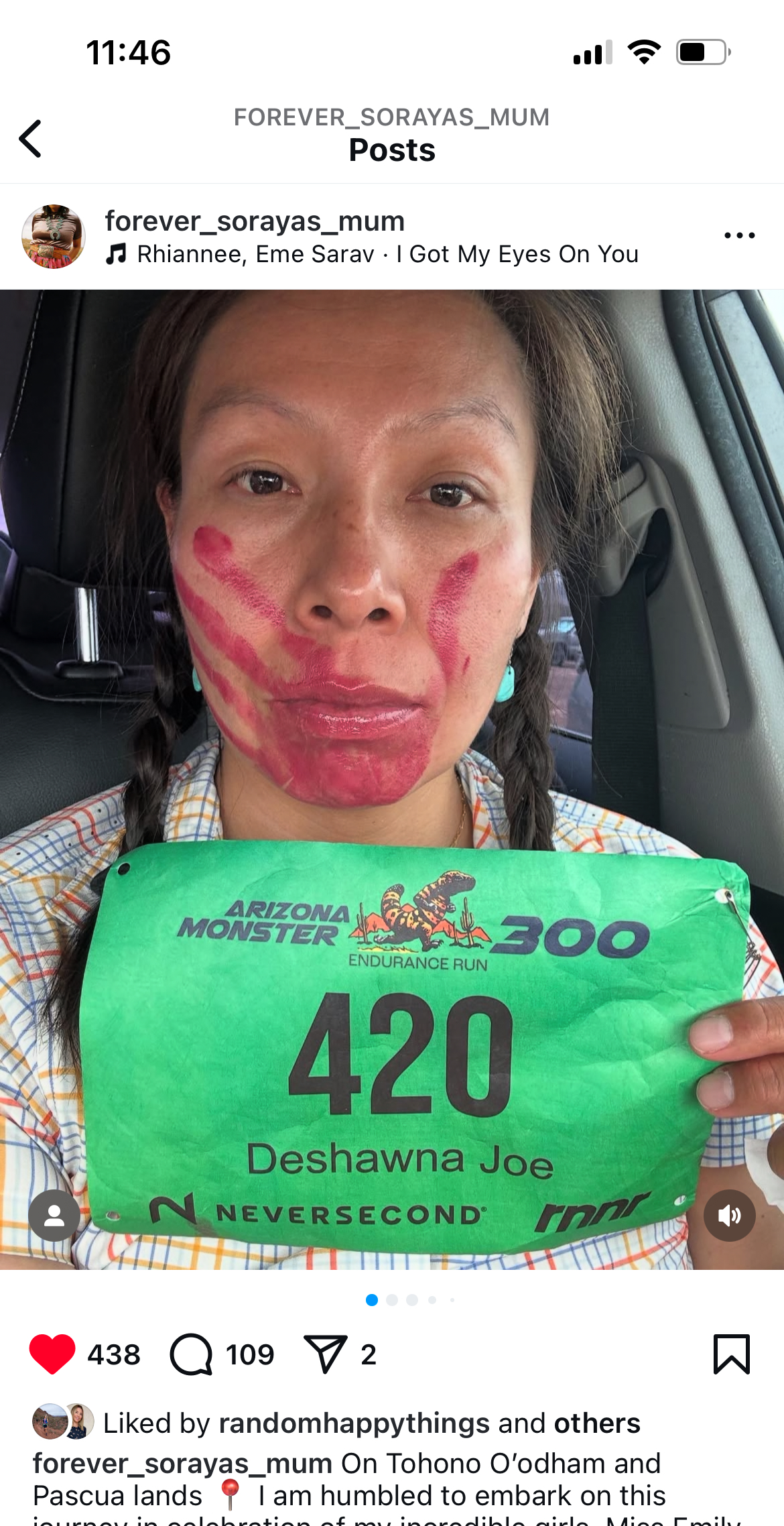 There are some familiar female faces in the 200-plus mile world, making their way through the Sonoran desert. Andrea Moore, 47, of Flagstaff, AZ is no stranger to the 200+ mile distances with two Cocodona 250 finishes as well as the Bigfoot 200 and Moab 240. She’s been averaging close to 60-miles per day and is on day four, moving towards the 230-mile marker. DeShawana Joe of Tremonton, Utah, is closing in on that 200-mile marker. Another fan-favorite, DeShawana Joe is a mother, a proud Native American woman and someone who has found both solace and community in ultrarunning. She runs in honor of her daughter. SoRaya, who was tragically killed by a distracted driver in September of 2023. DeShawana has talked about her daughter’s spirit guiding her and running along with her during last year’s Cocodona 250. She has a great support team out there her family and friends in Utah are rooting for her. She’s shown nothing but smiles almost 200-miles into this race.