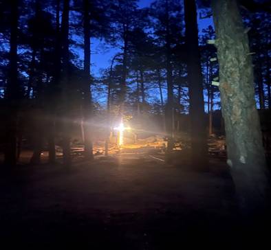 The sun was creeping through the pine trees on the livestream which meant that I needed to get moving. I quickly gathered my things and grabbed a few snacks from the aid-station to try and fuel me for the next push to Whiskey Row where I would see Seamus and Kip and be able to take a nap in the back of the rental car. That was the motivation I needed. I thanked the volunteers and headed out into the barely rising-sun. The birds were singing, there was a fresh smell of pine needles and the cross was still lit. Jesus was on my side and I was ready to make my way to downtown Prescott.