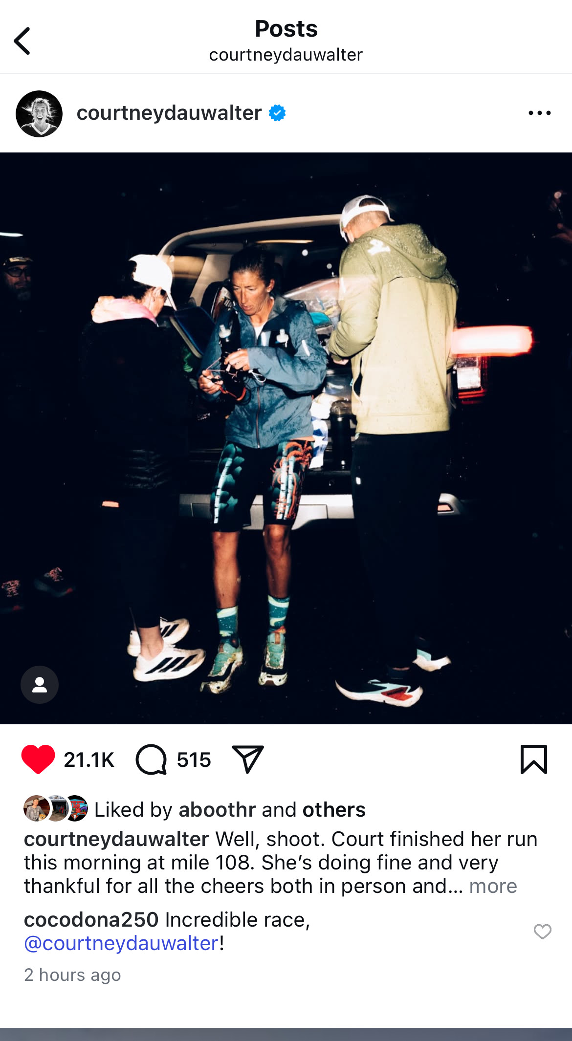 According to Courtney Dauwalter’s @instagram page she has dropped out of the race at mile 108. That would mean that she called it quits at Mt. Mingus Camp aid-station in the night. The post claims she is okay, and is grateful for having been part of the experience and wants fans to turn their attention to all of the other amazing runners in this 250-mile long race.