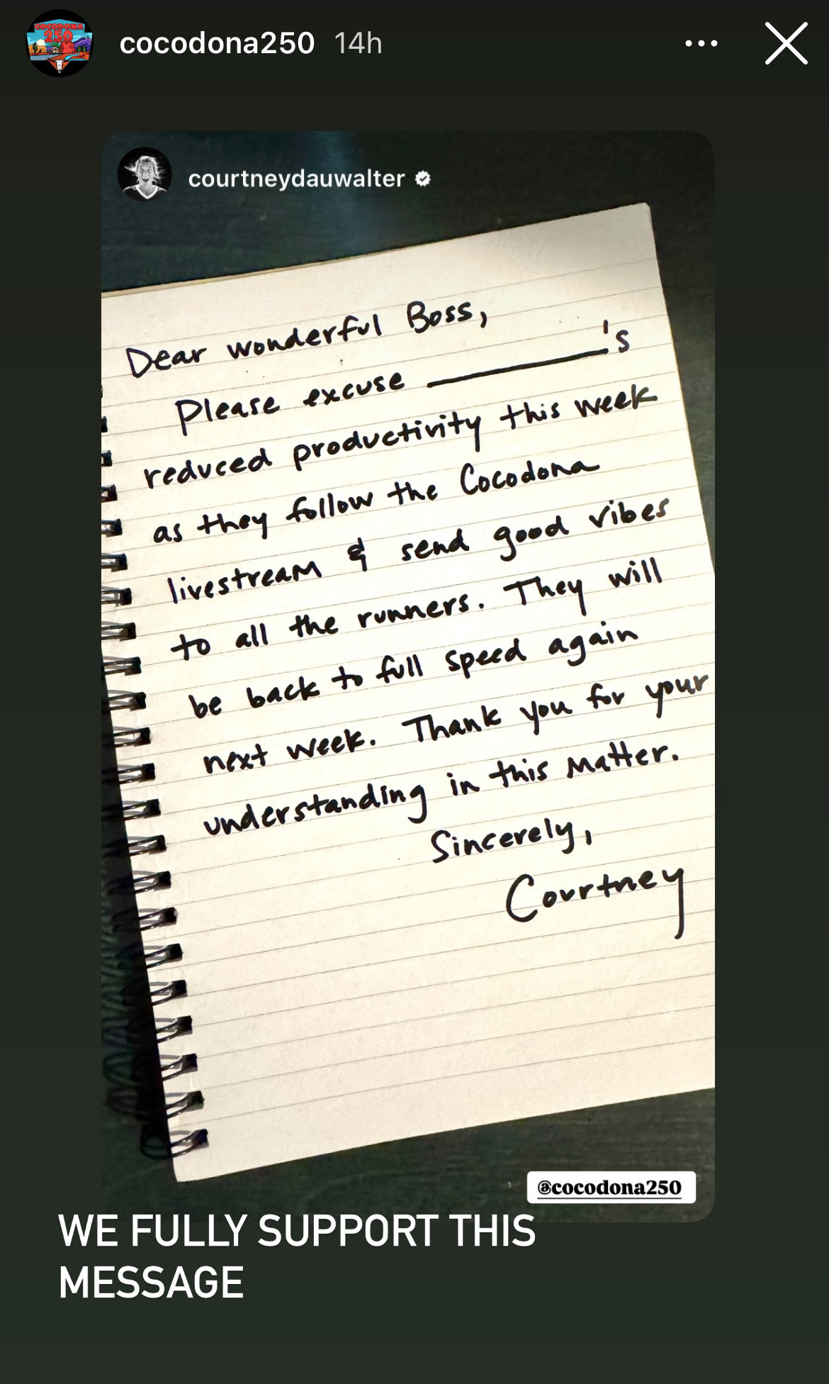 The hype was high and the Courtney Effect, which is the enthusiasm that skyrockets whenever Courtney Dauwalter, the greatest female ultrarunner of all time (GOAT) is in a race, could be felt around the ultrarunning universe. She left a funny note on her Instagram page of a hand written letter excusing everyone from work so that they could watch the livestream which will run until the last finisher crosses the line in Heritage Square in downtown Flagstaff.