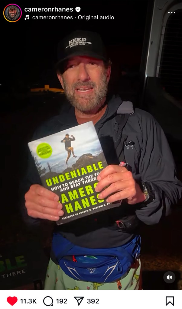Big Media has not slacked off one bit. Finn Melanson from The Singletrack Podcast, is currently sitting in 8th place. Kevin Goldberg of the Distance to Empty Podcast which focusses solely on 200+mile runs and multi-day events is running the course faster than he ever has and is now at mile 147. Jeff Garmire, of The Free Outside Podcast, who has run this race every year since it’s inception in 2021, is being paced by Jeff Peltier and after a tough night has moved back up in the pack to M11. Cameron Hanes is hammering away and has moved up to M18 at mile 136. Hanes was even advertising his new book, Undeniable, at mile 90 at 4am on Instagram. Ultrarunning’s favorite ambassador, Andy Jones-Wilkins, host of Crack a Brew with AJW, is making his way through the course with 2 new hips. Typically AJW, 57, who has a deep and storied ultra-career is on the livestream with Chris Worden, but this year the pull was too strong and he decided to begin his first foray in the 200+mile distance in his beloved Arizona.