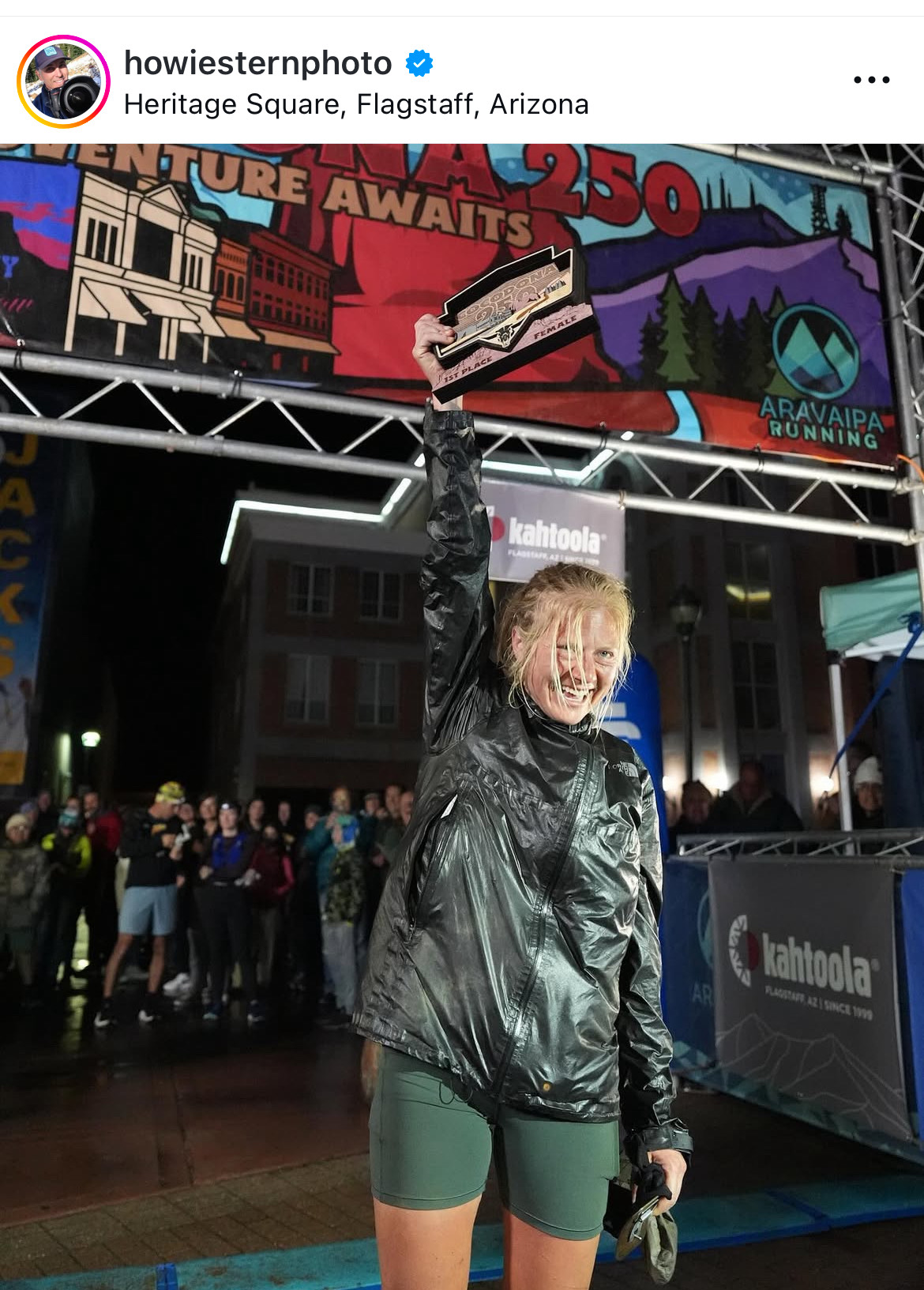 Dan Green, 28 of West Virginia is the new Cocodona 250 Champion, in a course record (CR) time of 58:47. He ran into Heritage Square in downtown Flagstaff looking like he was just out for an afternoon stroll and not about to wrap up 250-miles of running across Arizona. He was drinking a can of Coors Light as he ran into the finish where he celebrated with friends, crew and family. This is the first time a Beast Coaster has podiumed on the men’s side in Cocodona. Maybe all the rain and mud played into his West Virginian hands.