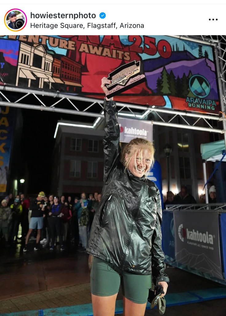 Professional trail-runner, Sally McRae who won the Grand Slam of 200+mile races in 2023 was cheering on Entrekin every step of the way in the live-chat. McRae noted that Entrekin had so much energy that she was hoping for a backflip with a half-twist as she made her way across that finish line. McRae was joined by Corrine Malcolm in the chat and Billy Yang, all 3 of which are ultrarunners, commentators and well known ambassadors of the sport. Entrekin was met by her parents, her crew, her boyfriend as well as race director Steve Adherholt who handed her the Cocodona trophy for the 2nd year in a row.